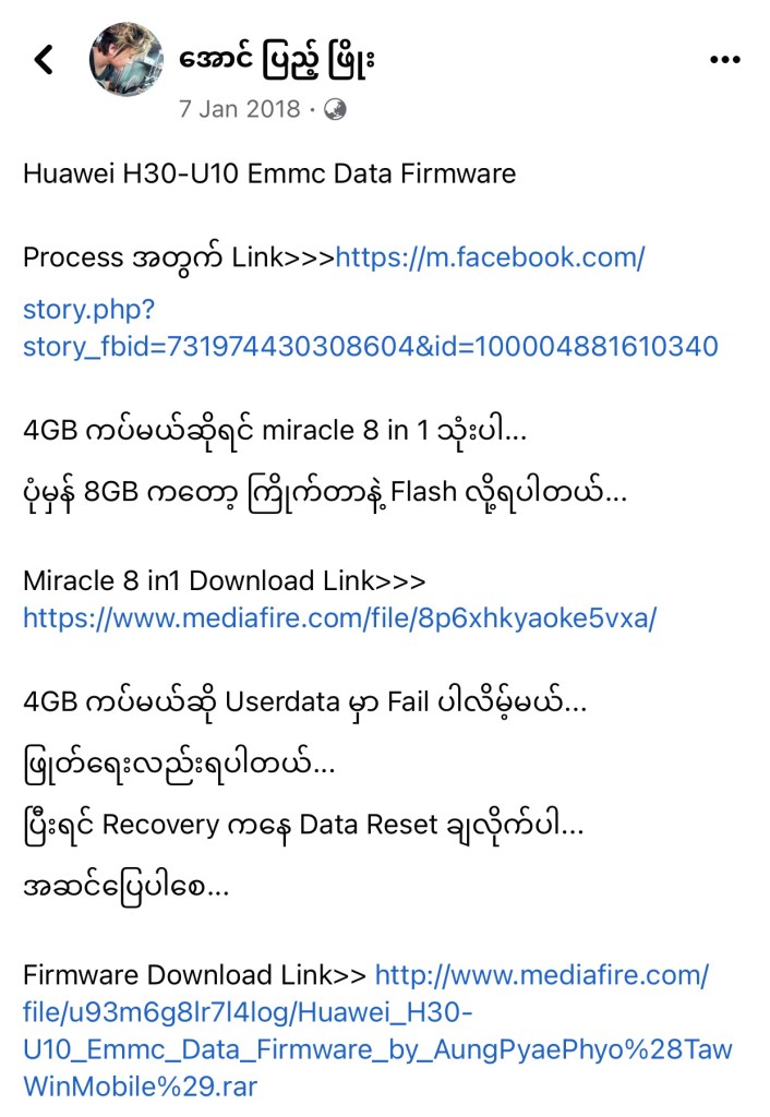 Firmware Download Link>> http://www.mediafire.com/file/u93m6g8lr7l4log/Huawei_H30-U10_Emmc_Data_Firmware_by_AungPyaePhyo%28TawWinMobile%29.rar